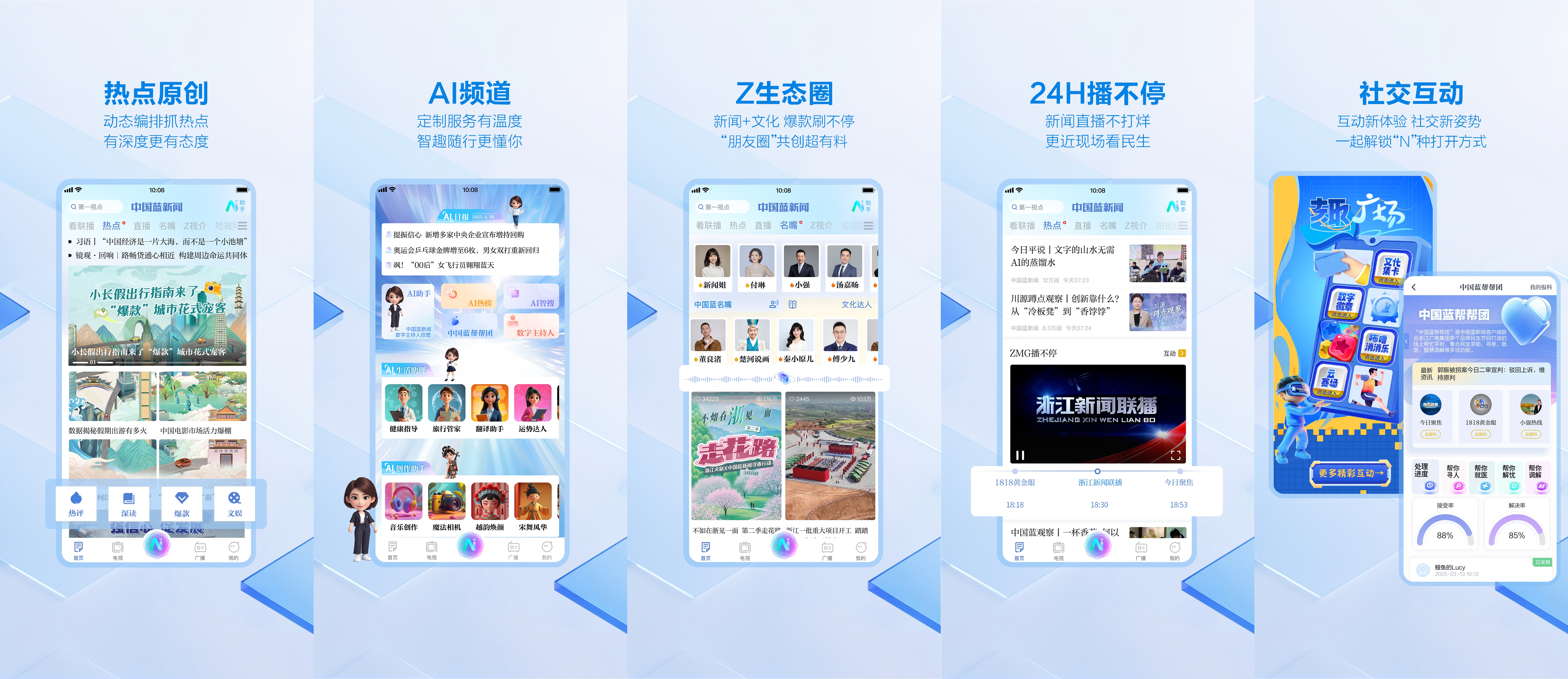 我国蓝新闻客户端作为传达纽带,以浙江卫视大屏新闻栏目带、Z视介、广电名嘴文明达人IP,以及美丽浙江、ZMG风云传达中心、1818黄金眼融媒、我国蓝世界等账号为依托,以央、省、市、县四级联动的新闻协作网为支撑,打造新式交融传达力,活跃构建“屏+端+网+号+IP”交融一体的全媒体传达新格局。