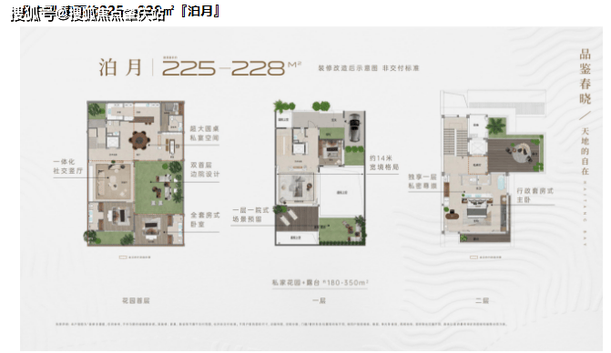B 户型:修建面积约 225-228㎡(双拼、独栋),总价 1150-2550 万,运用面积 400-500㎡,地上三层,院子面积 210-350㎡,4 房 2 厅 6 卫。花园首层为双首层边院规划,有一体化交际竖厅,全套房式卧室,中西双厨,超大私宴空间;一层有约 14 米宽境格式,一层一院式场景预留,私家车位,超大院子天台;二层为行政套房式主卧,独享一层,私密性强。